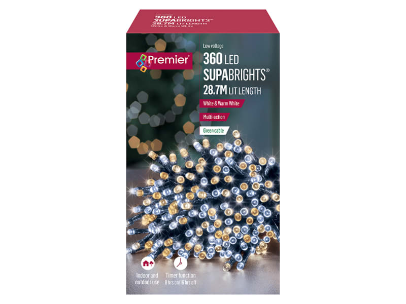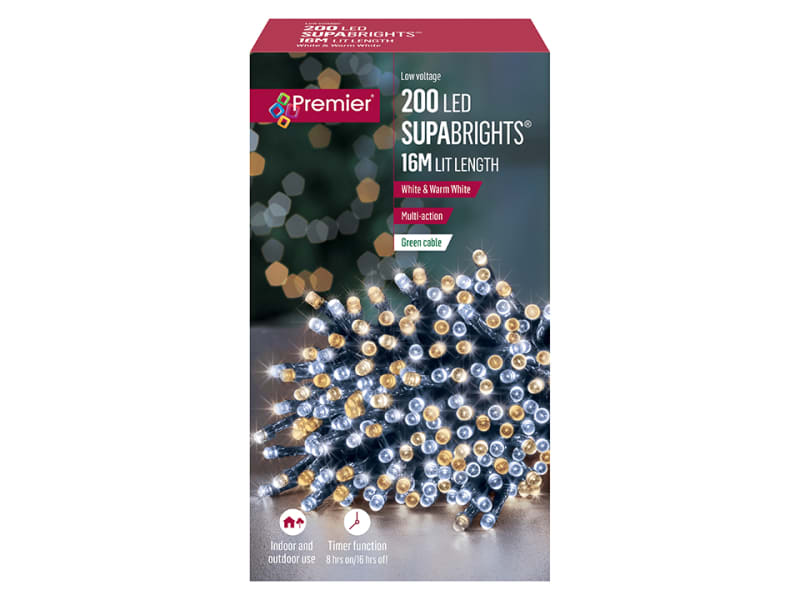 These multiaction time lights are fantastic money savers and so easy to use. Their built in timer allows them to turn on at the same time every day for 8 hours. The 200 or 360, low voltage LEDs are suitable for indoor and outdoor use, have 8 functions and a snowing speed controller